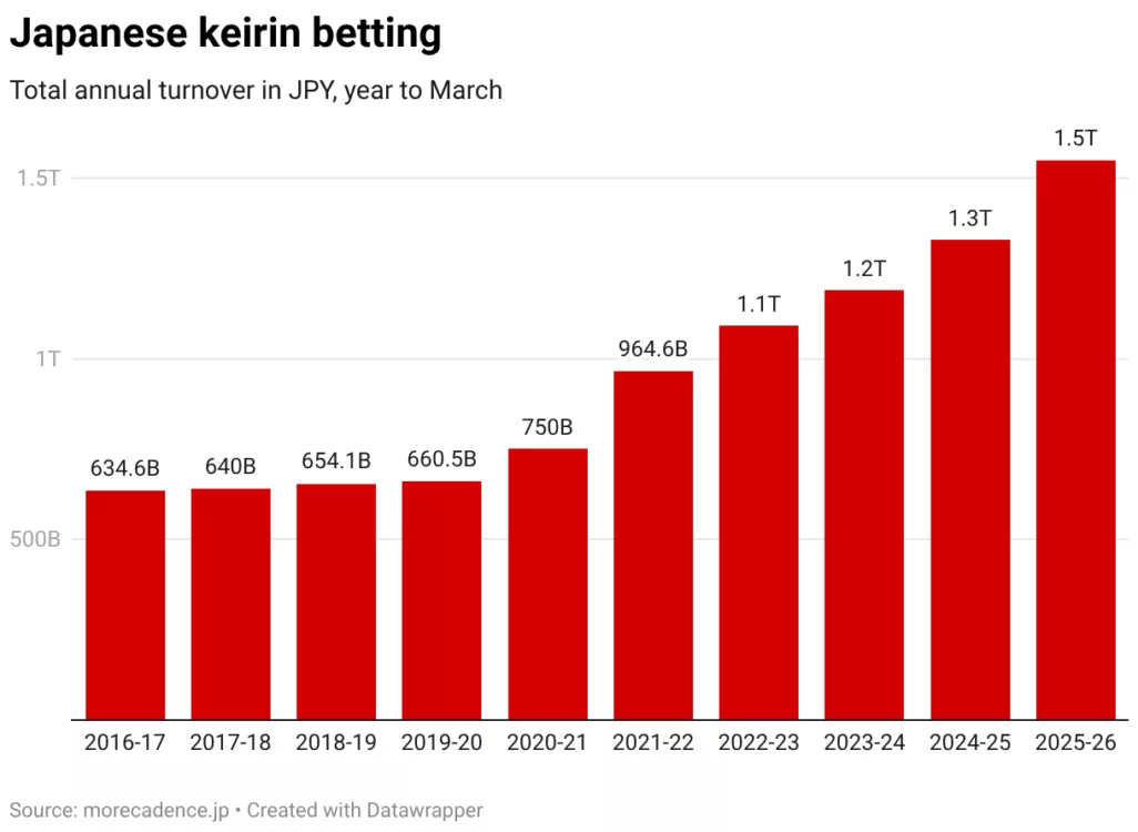 Betting turnover in the year to March 31, 2026 totalled 1.5487 trillion yen – US$ 9.77 billion, or GB£ 7.33 billion, up 16.6% on the 2025 figure.